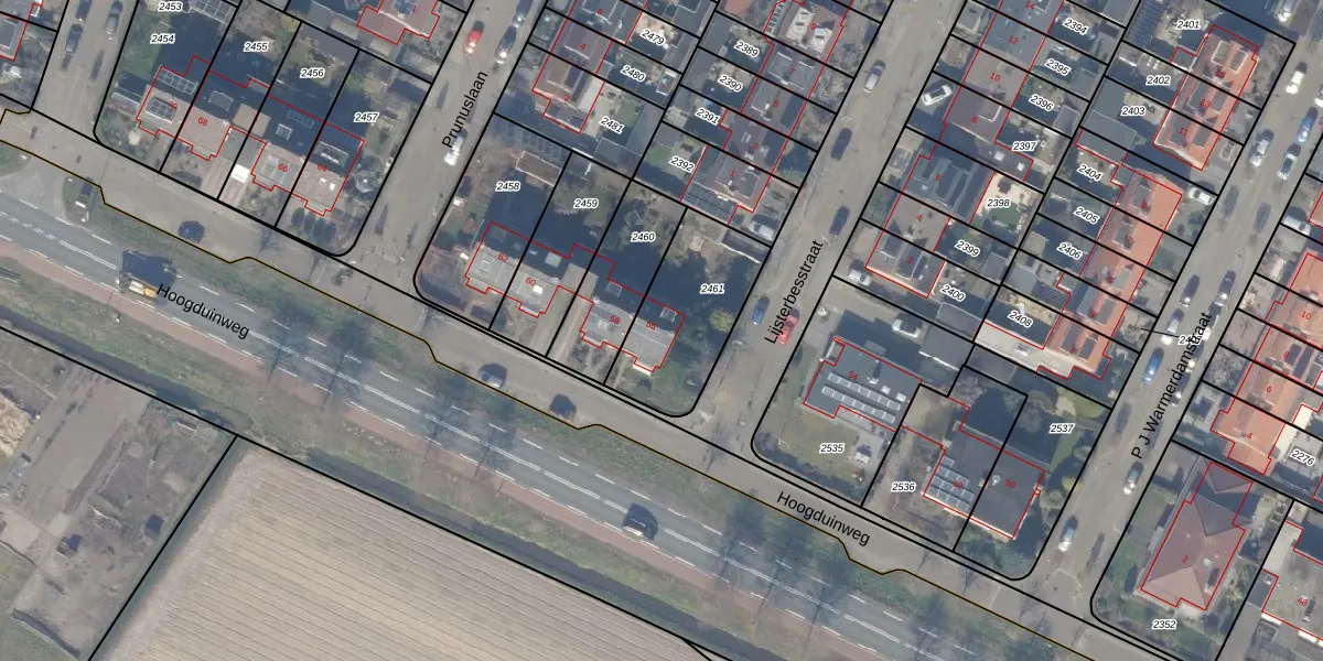 Hoogduinweg 56 is gelegen op kadastraal perceel NWK04A2461. Deze kadastrale aanduiding is uniek en wordt gebruikt door het Kadaster om eigendomsrechten en andere zakelijke rechten vast te leggen. Het perceel maakt onderdeel uit van de kadastrale gemeente Noordwijkerhout.