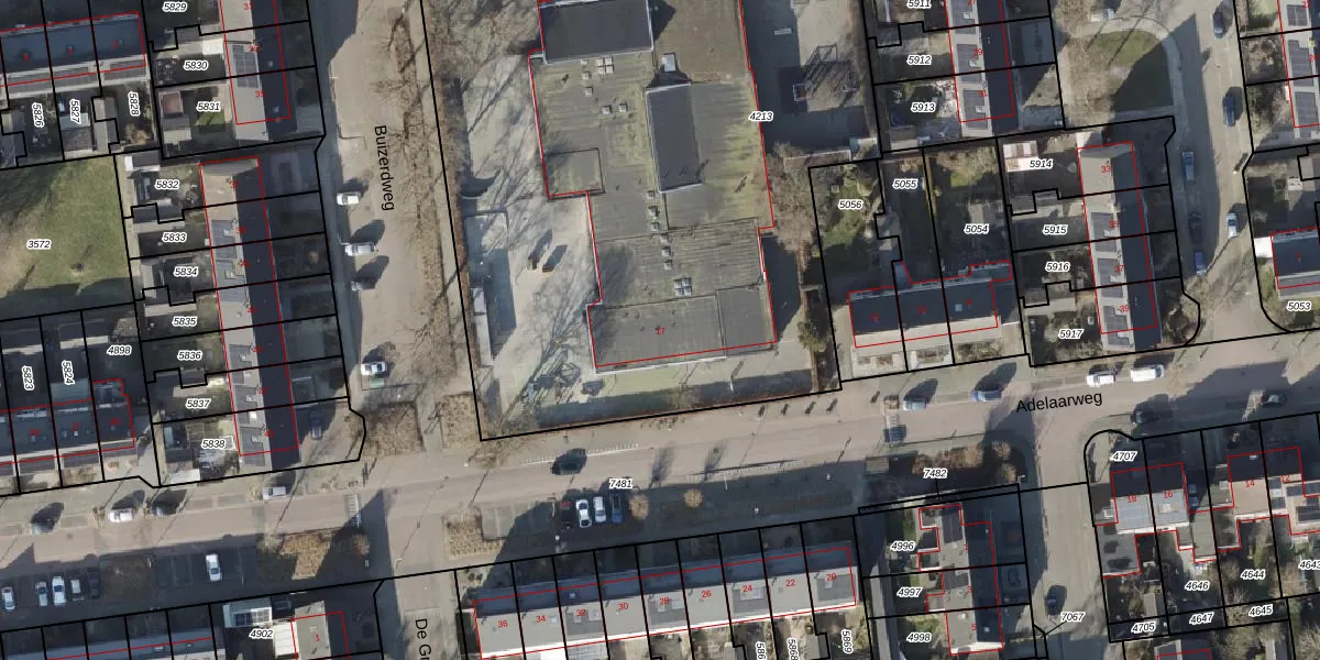 Het perceel waarop Adelaarweg 17 staat heeft een oppervlakte van 4725 m². Dit is een zeer groot perceel. De perceeloppervlakte wordt geregistreerd door het Kadaster. Gedetailleerde informatie over de maten van dit perceel kunt u vinden in het rapport Kadastrale kaart met maatvoering van Adelaarweg 17.
