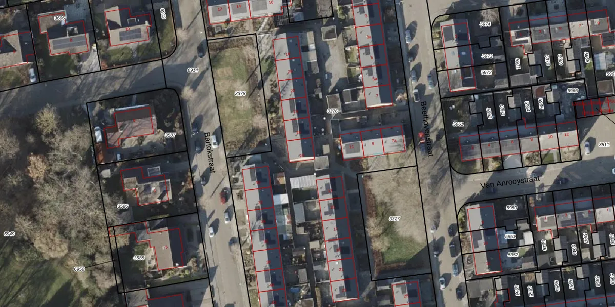 Het perceel waarop Bartokstraat 28 staat heeft een oppervlakte van 6751 m². Dit is een zeer groot perceel. De perceeloppervlakte wordt geregistreerd door het Kadaster. Gedetailleerde informatie over de maten van dit perceel kunt u vinden in het rapport Kadastrale kaart met maatvoering van Bartokstraat 28.