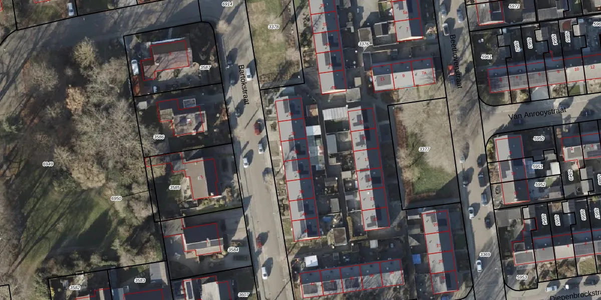 Het perceel waarop Bartokstraat 34 staat heeft een oppervlakte van 6751 m². Dit is een zeer groot perceel. De perceeloppervlakte wordt geregistreerd door het Kadaster. Gedetailleerde informatie over de maten van dit perceel kunt u vinden in het rapport Kadastrale kaart met maatvoering van Bartokstraat 34.