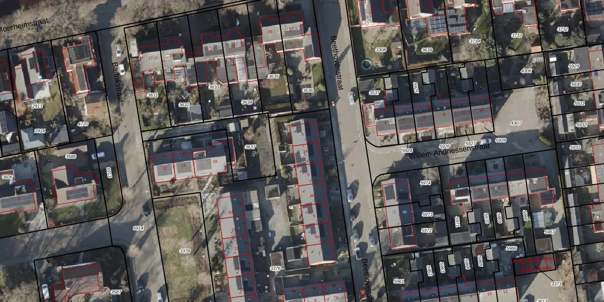 Het perceel waarop Beethovenstraat 1-a staat heeft een oppervlakte van 6751 m². Dit is een zeer groot perceel. De perceeloppervlakte wordt geregistreerd door het Kadaster. Gedetailleerde informatie over de maten van dit perceel kunt u vinden in het rapport Kadastrale kaart met maatvoering van Beethovenstraat 1-a.