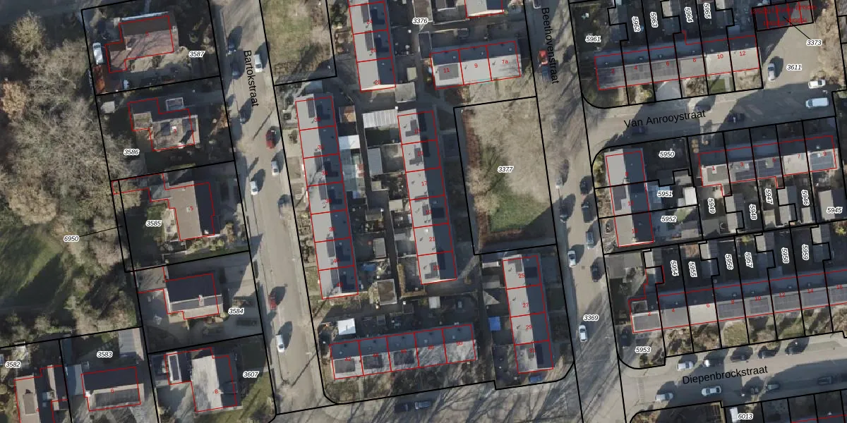 Het perceel waarop Beethovenstraat 19 staat heeft een oppervlakte van 6751 m². Dit is een zeer groot perceel. De perceeloppervlakte wordt geregistreerd door het Kadaster. Gedetailleerde informatie over de maten van dit perceel kunt u vinden in het rapport Kadastrale kaart met maatvoering van Beethovenstraat 19.