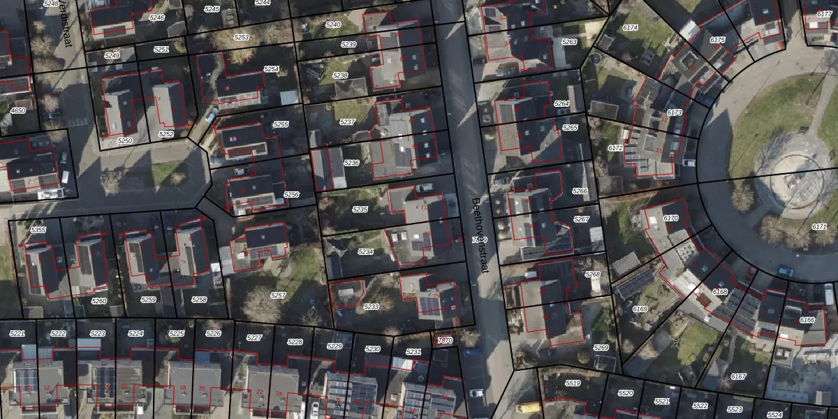 Het perceel waarop Beethovenstraat 71 staat heeft een oppervlakte van 353 m². Dit is een groot perceel. De perceeloppervlakte wordt geregistreerd door het Kadaster. Gedetailleerde informatie over de maten van dit perceel kunt u vinden in het rapport Kadastrale kaart met maatvoering van Beethovenstraat 71.