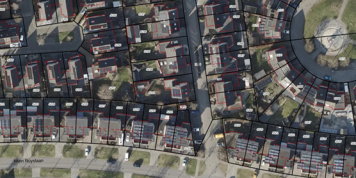 Het perceel waarop Beethovenstraat 75 staat heeft een oppervlakte van 487 m². Dit is een groot perceel. De perceeloppervlakte wordt geregistreerd door het Kadaster. Gedetailleerde informatie over de maten van dit perceel kunt u vinden in het rapport Kadastrale kaart met maatvoering van Beethovenstraat 75.