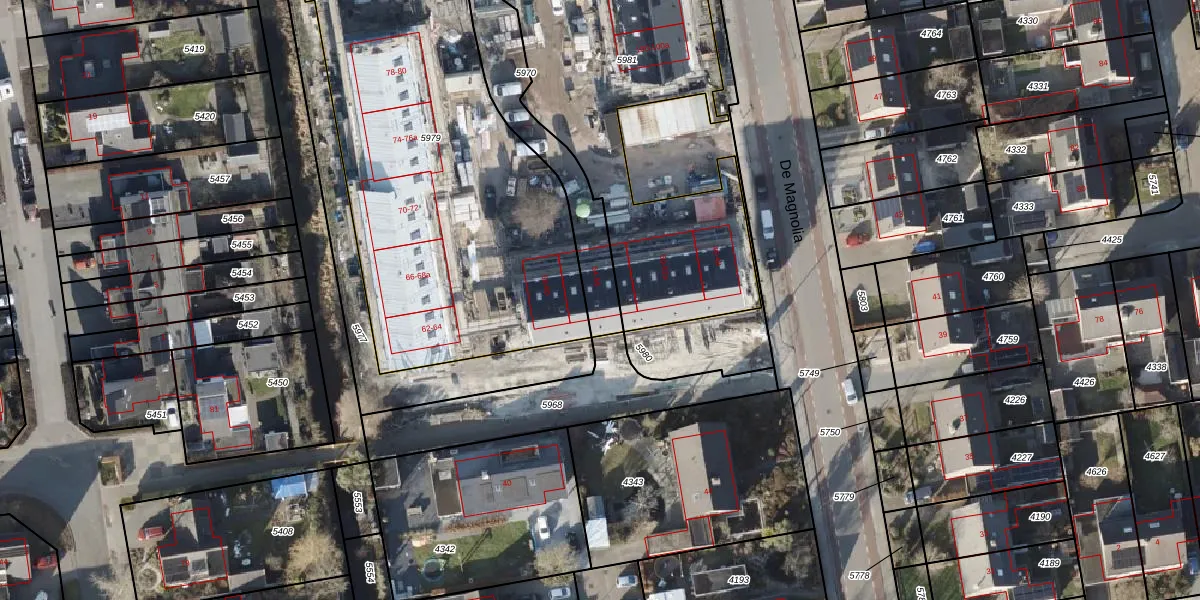 Het perceel waarop De Magnolia 54-a staat heeft een oppervlakte van 518 m². Dit is een groot perceel. De perceeloppervlakte wordt geregistreerd door het Kadaster. Gedetailleerde informatie over de maten van dit perceel kunt u vinden in het rapport Kadastrale kaart met maatvoering van De Magnolia 54-a.