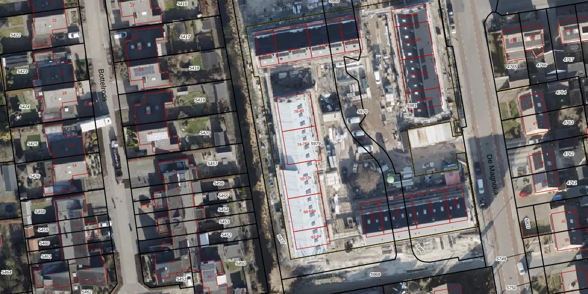 Het perceel waarop De Magnolia 76-a staat heeft een oppervlakte van 2468 m². Dit is een zeer groot perceel. De perceeloppervlakte wordt geregistreerd door het Kadaster. Gedetailleerde informatie over de maten van dit perceel kunt u vinden in het rapport Kadastrale kaart met maatvoering van De Magnolia 76-a.