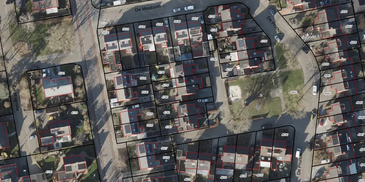 Het perceel waarop De Prunus 56 staat heeft een oppervlakte van 249 m². Dit is een middelgroot perceel. De perceeloppervlakte wordt geregistreerd door het Kadaster. Gedetailleerde informatie over de maten van dit perceel kunt u vinden in het rapport Kadastrale kaart met maatvoering van De Prunus 56.