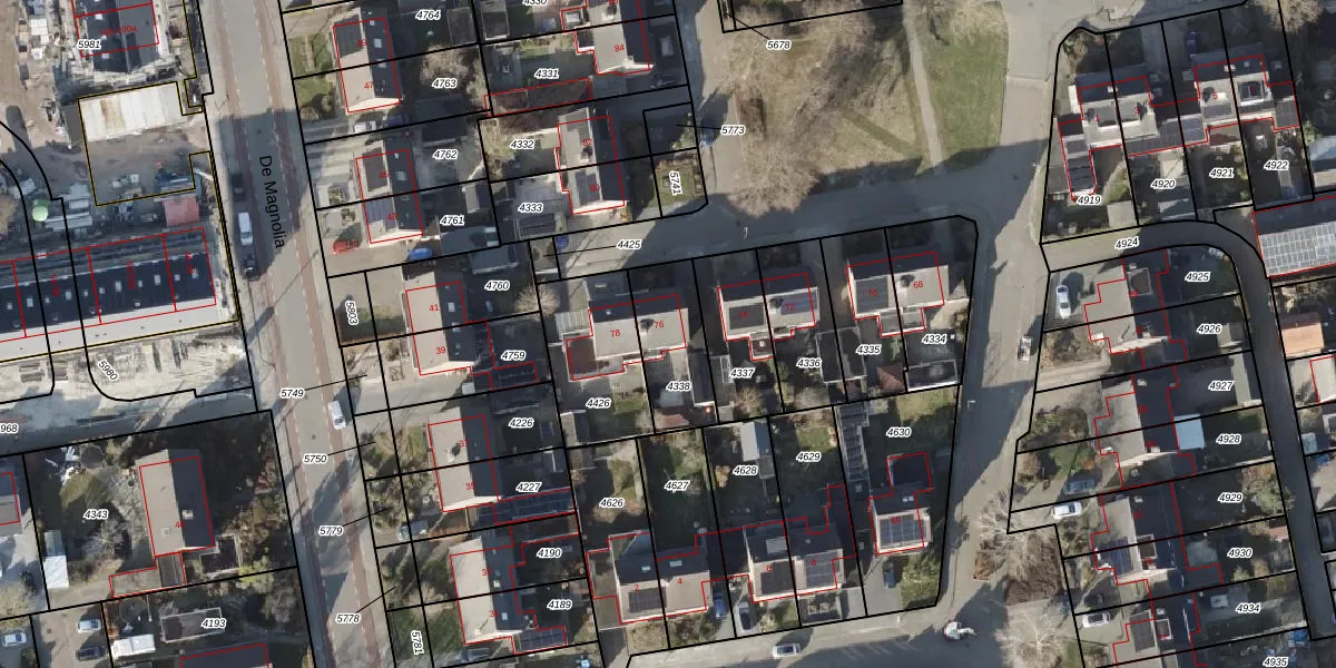 Het perceel waarop De Prunus 76 staat heeft een oppervlakte van 245 m². Dit is een middelgroot perceel. De perceeloppervlakte wordt geregistreerd door het Kadaster. Gedetailleerde informatie over de maten van dit perceel kunt u vinden in het rapport Kadastrale kaart met maatvoering van De Prunus 76.