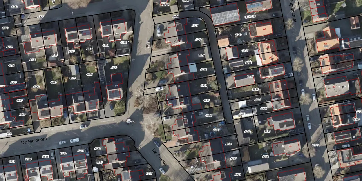 Het perceel waarop De Prunus 81 staat heeft een oppervlakte van 313 m². Dit is een groot perceel. De perceeloppervlakte wordt geregistreerd door het Kadaster. Gedetailleerde informatie over de maten van dit perceel kunt u vinden in het rapport Kadastrale kaart met maatvoering van De Prunus 81.