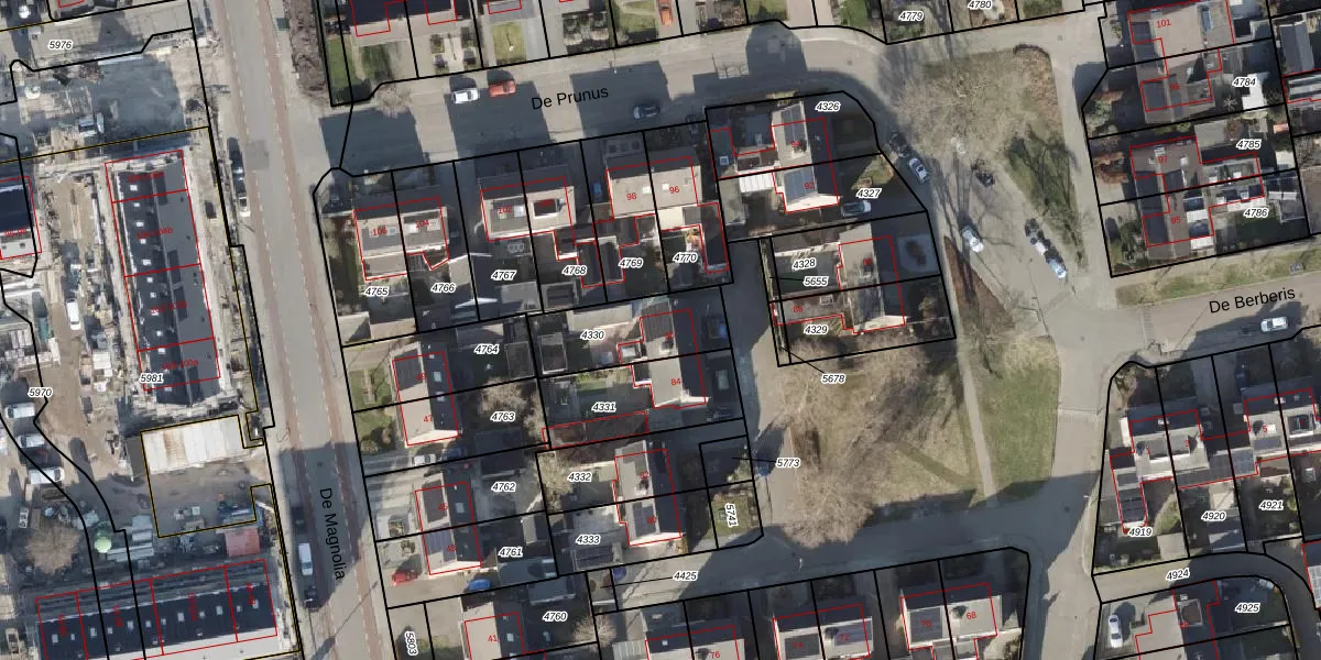 Het perceel waarop De Prunus 86 staat heeft een oppervlakte van 292 m². Dit is een middelgroot perceel. De perceeloppervlakte wordt geregistreerd door het Kadaster. Gedetailleerde informatie over de maten van dit perceel kunt u vinden in het rapport Kadastrale kaart met maatvoering van De Prunus 86.