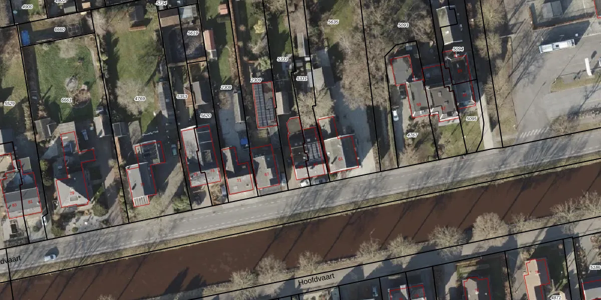 Het perceel waarop Hoofdvaart 65 staat heeft een oppervlakte van 592 m². Dit is een groot perceel. De perceeloppervlakte wordt geregistreerd door het Kadaster. Gedetailleerde informatie over de maten van dit perceel kunt u vinden in het rapport Kadastrale kaart met maatvoering van Hoofdvaart 65.