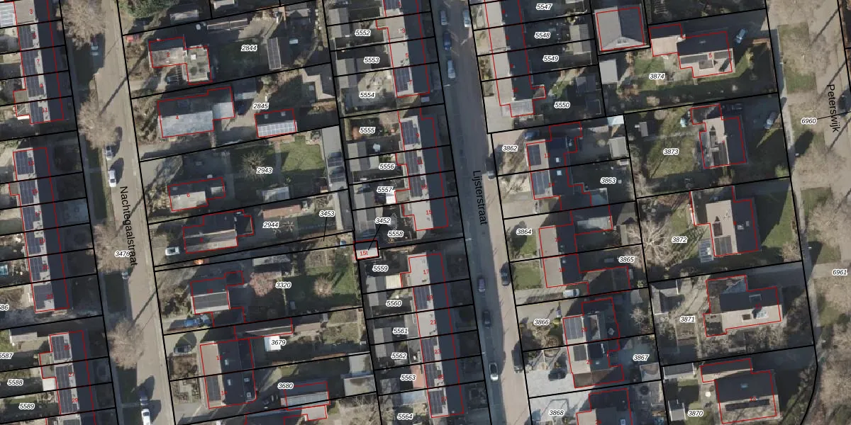 Het perceel waarop Lijsterstraat 15 staat heeft een oppervlakte van 242 m². Dit is een middelgroot perceel. De perceeloppervlakte wordt geregistreerd door het Kadaster. Gedetailleerde informatie over de maten van dit perceel kunt u vinden in het rapport Kadastrale kaart met maatvoering van Lijsterstraat 15.