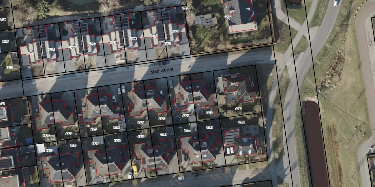 Het perceel waarop Marisstraat 13 staat heeft een oppervlakte van 322 m². Dit is een groot perceel. De perceeloppervlakte wordt geregistreerd door het Kadaster. Gedetailleerde informatie over de maten van dit perceel kunt u vinden in het rapport Kadastrale kaart met maatvoering van Marisstraat 13.