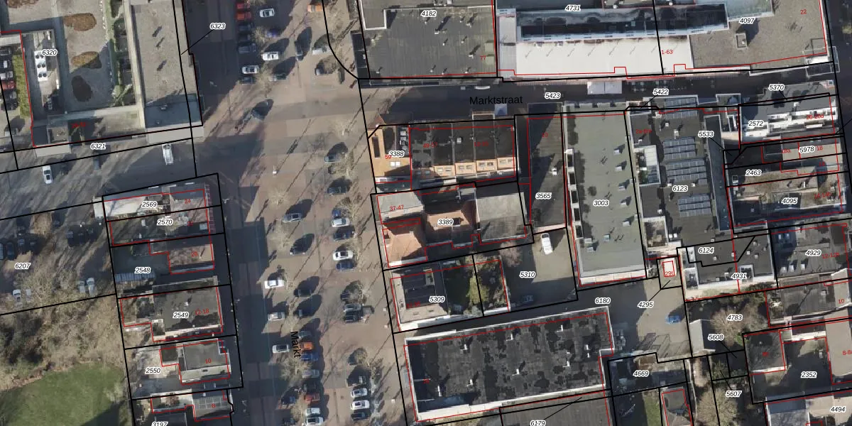 Het perceel waarop Markt 41 staat heeft een oppervlakte van 587 m². Dit is een groot perceel. De perceeloppervlakte wordt geregistreerd door het Kadaster. Gedetailleerde informatie over de maten van dit perceel kunt u vinden in het rapport Kadastrale kaart met maatvoering van Markt 41.