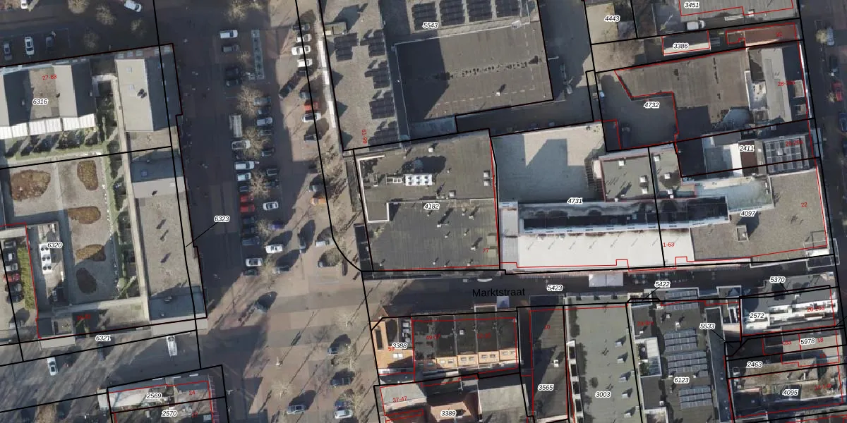 Het perceel waarop Markt 67 staat heeft een oppervlakte van 1010 m². Dit is een zeer groot perceel. De perceeloppervlakte wordt geregistreerd door het Kadaster. Gedetailleerde informatie over de maten van dit perceel kunt u vinden in het rapport Kadastrale kaart met maatvoering van Markt 67.