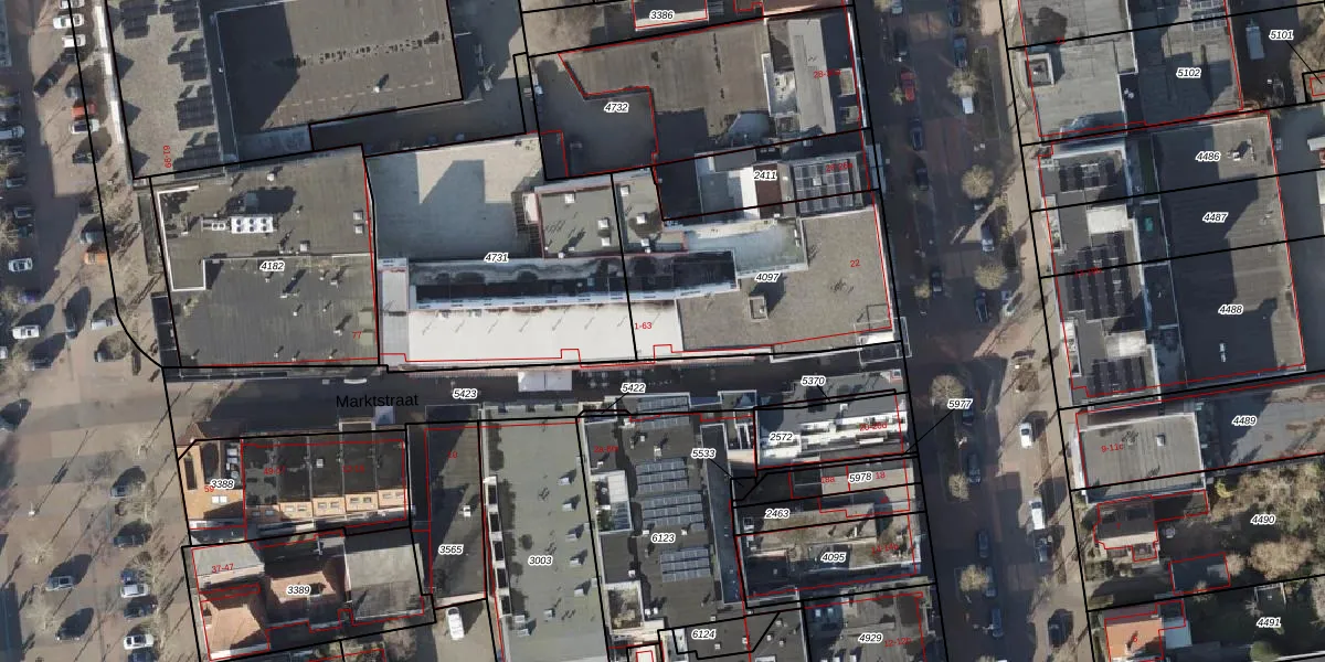Het perceel waarop Marktstraat 33 staat heeft een oppervlakte van 942 m². Dit is een groot perceel. De perceeloppervlakte wordt geregistreerd door het Kadaster. Gedetailleerde informatie over de maten van dit perceel kunt u vinden in het rapport Kadastrale kaart met maatvoering van Marktstraat 33.