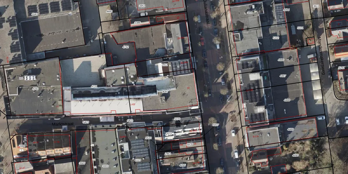 Het perceel waarop Marktstraat 45 staat heeft een oppervlakte van 942 m². Dit is een groot perceel. De perceeloppervlakte wordt geregistreerd door het Kadaster. Gedetailleerde informatie over de maten van dit perceel kunt u vinden in het rapport Kadastrale kaart met maatvoering van Marktstraat 45.