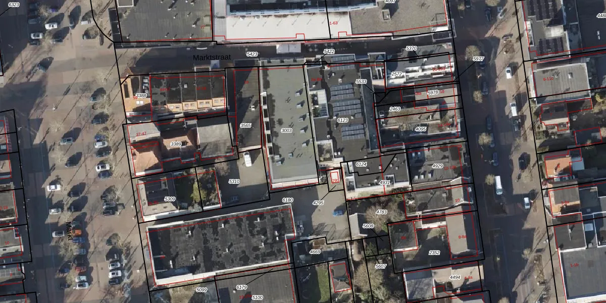 Het perceel waarop Marktstraat 8-c staat heeft een oppervlakte van 658 m². Dit is een groot perceel. De perceeloppervlakte wordt geregistreerd door het Kadaster. Gedetailleerde informatie over de maten van dit perceel kunt u vinden in het rapport Kadastrale kaart met maatvoering van Marktstraat 8-c.