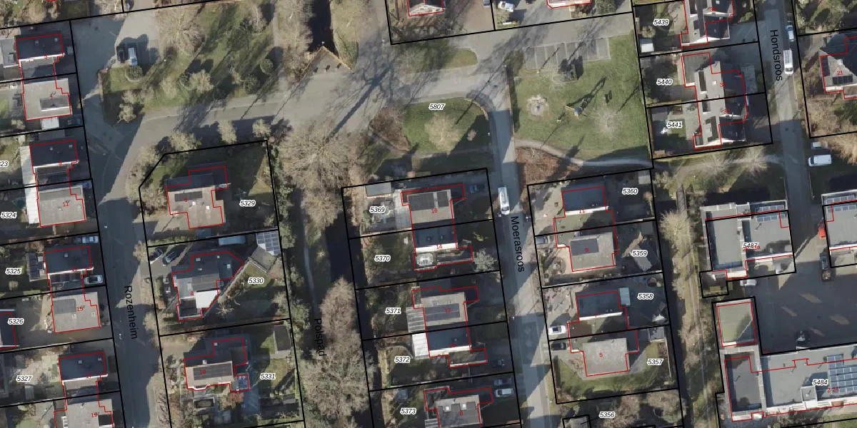 Het perceel waarop Moerasroos 16 staat heeft een oppervlakte van 410 m². Dit is een groot perceel. De perceeloppervlakte wordt geregistreerd door het Kadaster. Gedetailleerde informatie over de maten van dit perceel kunt u vinden in het rapport Kadastrale kaart met maatvoering van Moerasroos 16.