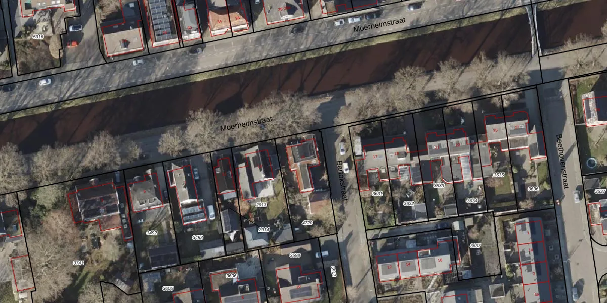 Het perceel waarop Moerheimstraat 15 staat heeft een oppervlakte van 523 m². Dit is een groot perceel. De perceeloppervlakte wordt geregistreerd door het Kadaster. Gedetailleerde informatie over de maten van dit perceel kunt u vinden in het rapport Kadastrale kaart met maatvoering van Moerheimstraat 15.