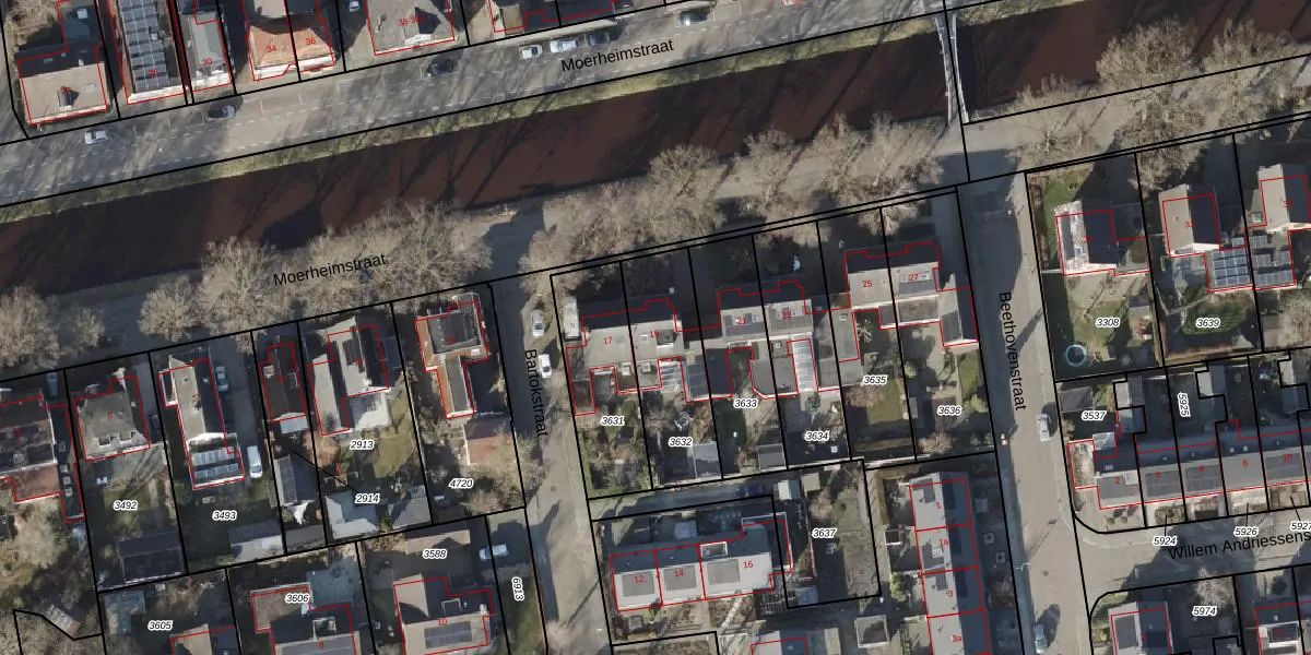 Het perceel waarop Moerheimstraat 19 staat heeft een oppervlakte van 379 m². Dit is een groot perceel. De perceeloppervlakte wordt geregistreerd door het Kadaster. Gedetailleerde informatie over de maten van dit perceel kunt u vinden in het rapport Kadastrale kaart met maatvoering van Moerheimstraat 19.