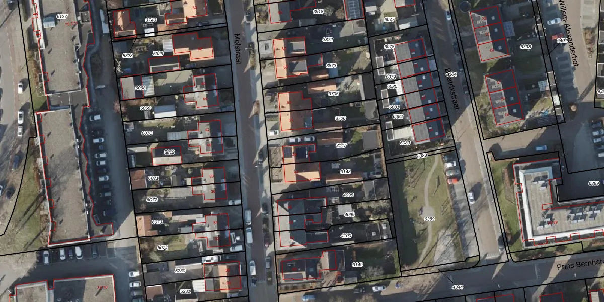 Gebruik de zoekbalk of klik op een perceel voor informatie over de adressen binnen dit perceel.