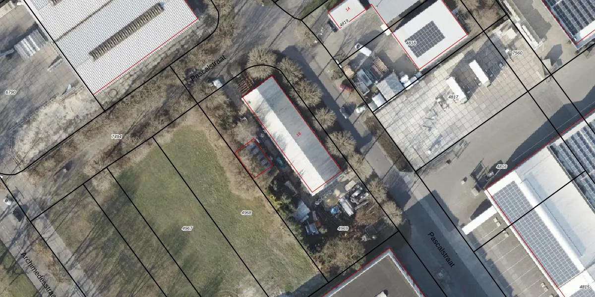 Het perceel waarop Pascalstraat 18 staat heeft een oppervlakte van 2173 m². Dit is een zeer groot perceel. De perceeloppervlakte wordt geregistreerd door het Kadaster. Gedetailleerde informatie over de maten van dit perceel kunt u vinden in het rapport Kadastrale kaart met maatvoering van Pascalstraat 18.