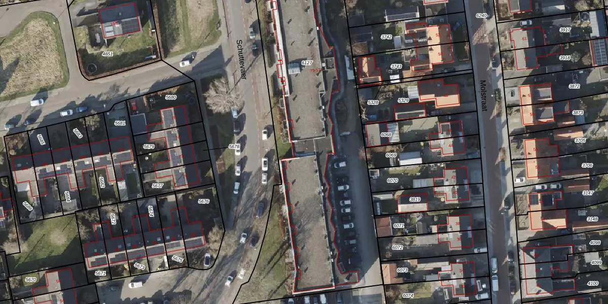 Het perceel waarop Schuttevaer 117 staat heeft een oppervlakte van 5100 m². Dit is een zeer groot perceel. De perceeloppervlakte wordt geregistreerd door het Kadaster. Gedetailleerde informatie over de maten van dit perceel kunt u vinden in het rapport Kadastrale kaart met maatvoering van Schuttevaer 117.