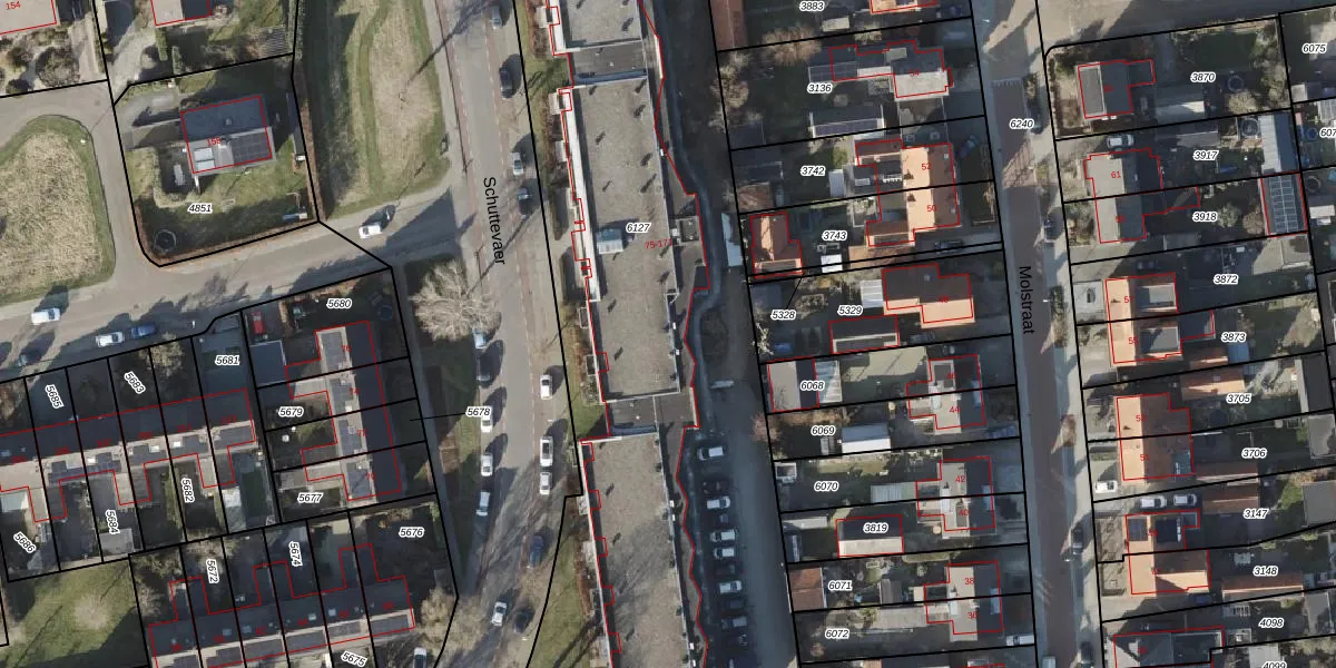 Het perceel waarop Schuttevaer 153 staat heeft een oppervlakte van 5100 m². Dit is een zeer groot perceel. De perceeloppervlakte wordt geregistreerd door het Kadaster. Gedetailleerde informatie over de maten van dit perceel kunt u vinden in het rapport Kadastrale kaart met maatvoering van Schuttevaer 153.