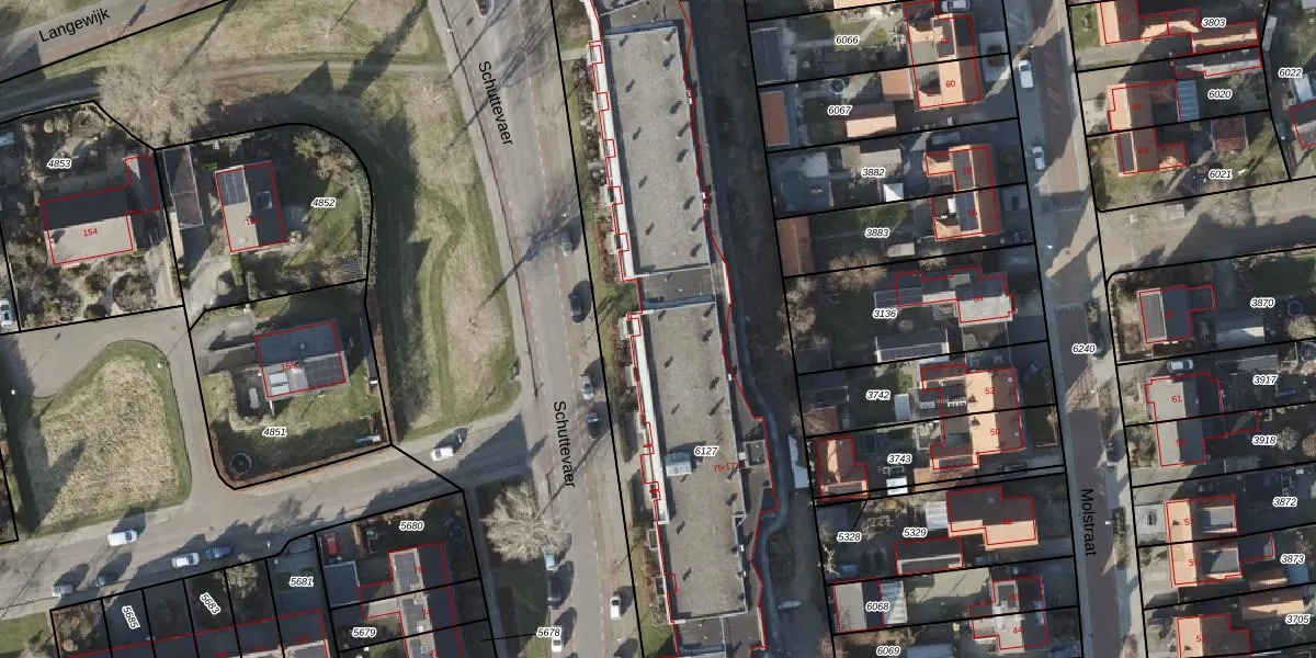 Het perceel waarop Schuttevaer 97 staat heeft een oppervlakte van 5100 m². Dit is een zeer groot perceel. De perceeloppervlakte wordt geregistreerd door het Kadaster. Gedetailleerde informatie over de maten van dit perceel kunt u vinden in het rapport Kadastrale kaart met maatvoering van Schuttevaer 97.