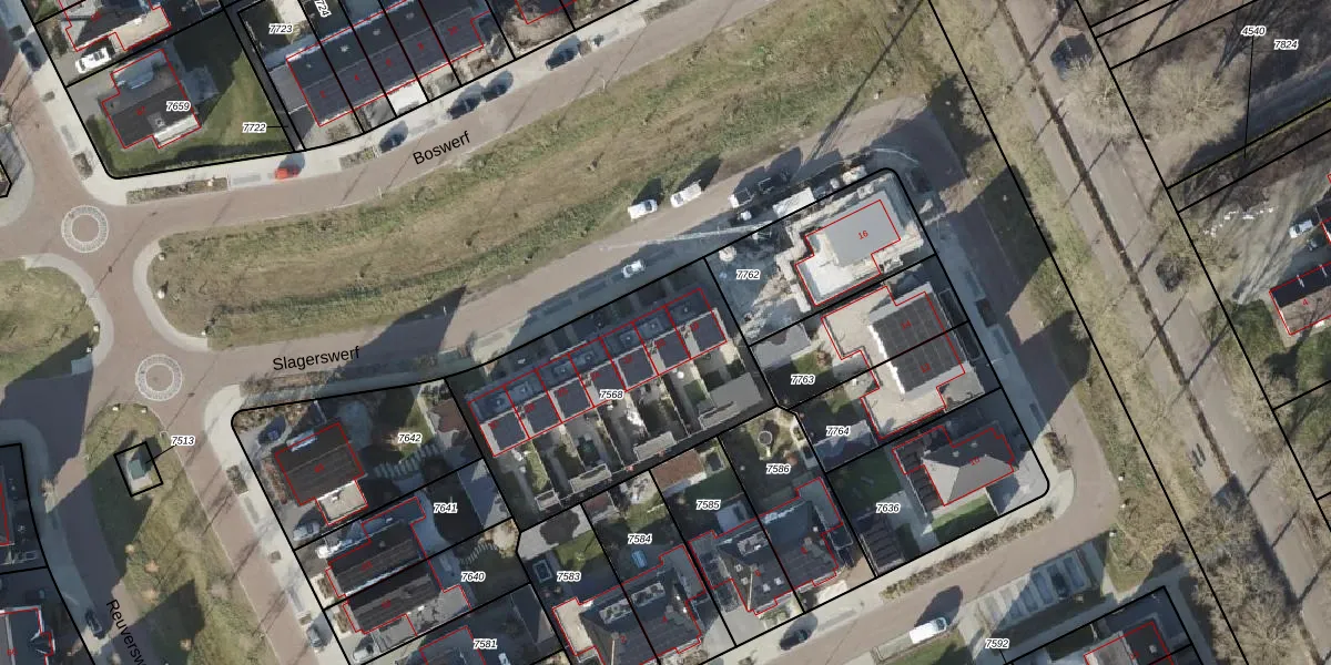 Het perceel waarop Slagerswerf 20 staat heeft een oppervlakte van 1075 m². Dit is een zeer groot perceel. De perceeloppervlakte wordt geregistreerd door het Kadaster. Gedetailleerde informatie over de maten van dit perceel kunt u vinden in het rapport Kadastrale kaart met maatvoering van Slagerswerf 20.