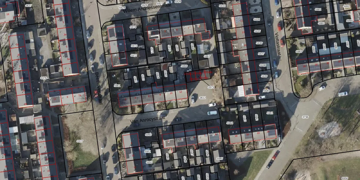 Van Anrooystraat 12 is gelegen op kadastraal perceel AVE00K5966. Deze kadastrale aanduiding is uniek en wordt gebruikt door het Kadaster om eigendomsrechten en andere zakelijke rechten vast te leggen. Het perceel maakt onderdeel uit van de kadastrale gemeente Avereest.