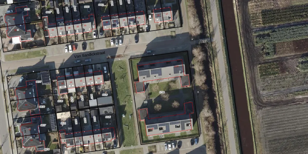 Het perceel waarop Van Sandickstraat 12-a staat heeft een oppervlakte van 2155 m². Dit is een zeer groot perceel. De perceeloppervlakte wordt geregistreerd door het Kadaster. Gedetailleerde informatie over de maten van dit perceel kunt u vinden in het rapport Kadastrale kaart met maatvoering van Van Sandickstraat 12-a.