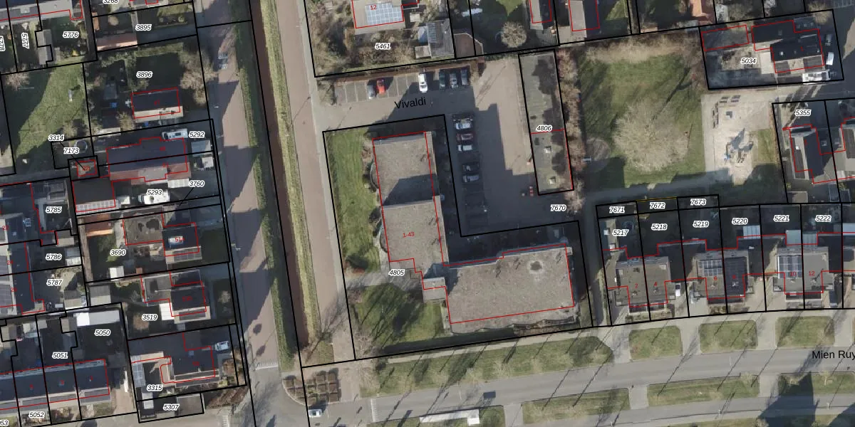 Het perceel waarop Vivaldi 33 staat heeft een oppervlakte van 2223 m². Dit is een zeer groot perceel. De perceeloppervlakte wordt geregistreerd door het Kadaster. Gedetailleerde informatie over de maten van dit perceel kunt u vinden in het rapport Kadastrale kaart met maatvoering van Vivaldi 33.