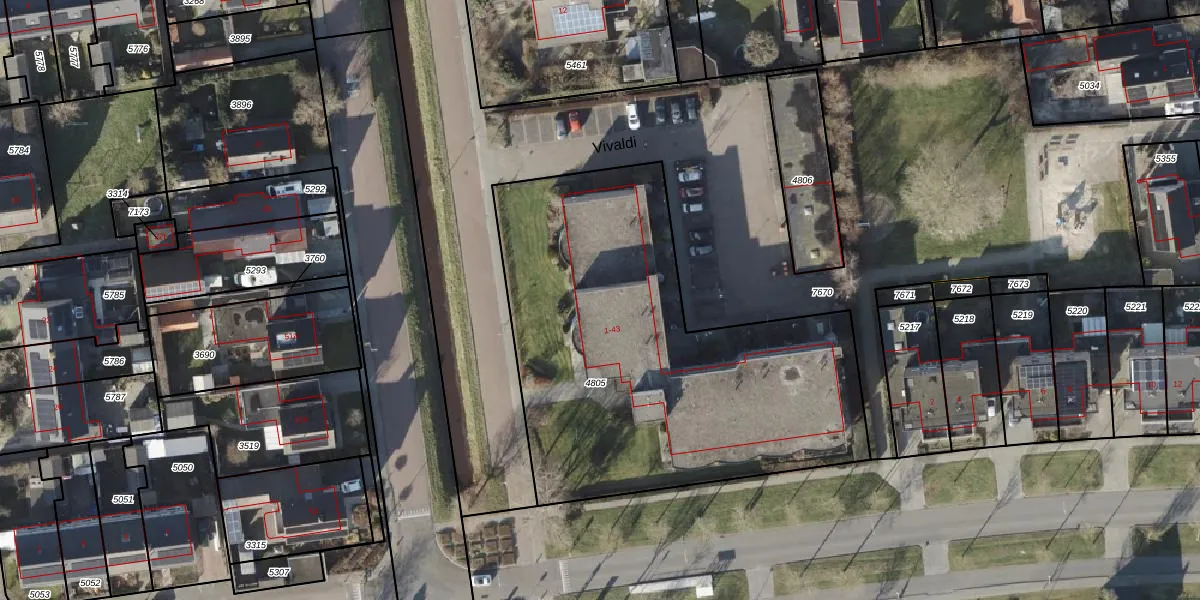 Het perceel waarop Vivaldi 5 staat heeft een oppervlakte van 2223 m². Dit is een zeer groot perceel. De perceeloppervlakte wordt geregistreerd door het Kadaster. Gedetailleerde informatie over de maten van dit perceel kunt u vinden in het rapport Kadastrale kaart met maatvoering van Vivaldi 5.