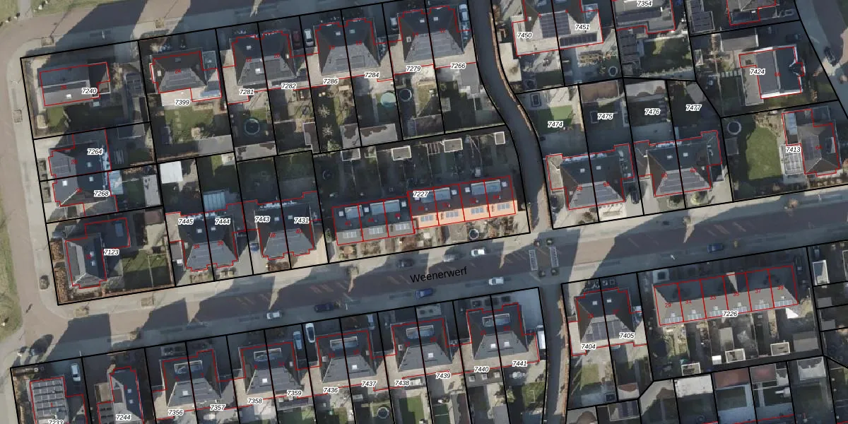 Het perceel waarop Weenerwerf 48 staat heeft een oppervlakte van 1243 m². Dit is een zeer groot perceel. De perceeloppervlakte wordt geregistreerd door het Kadaster. Gedetailleerde informatie over de maten van dit perceel kunt u vinden in het rapport Kadastrale kaart met maatvoering van Weenerwerf 48.