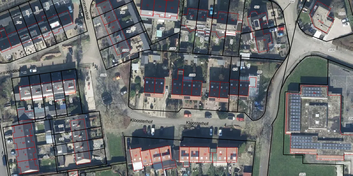 Het perceel waarop Kloosterhof 5 staat heeft een oppervlakte van 1826 m². Dit is een zeer groot perceel. De perceeloppervlakte wordt geregistreerd door het Kadaster. Gedetailleerde informatie over de maten van dit perceel kunt u vinden in het rapport Kadastrale kaart met maatvoering van Kloosterhof 5.