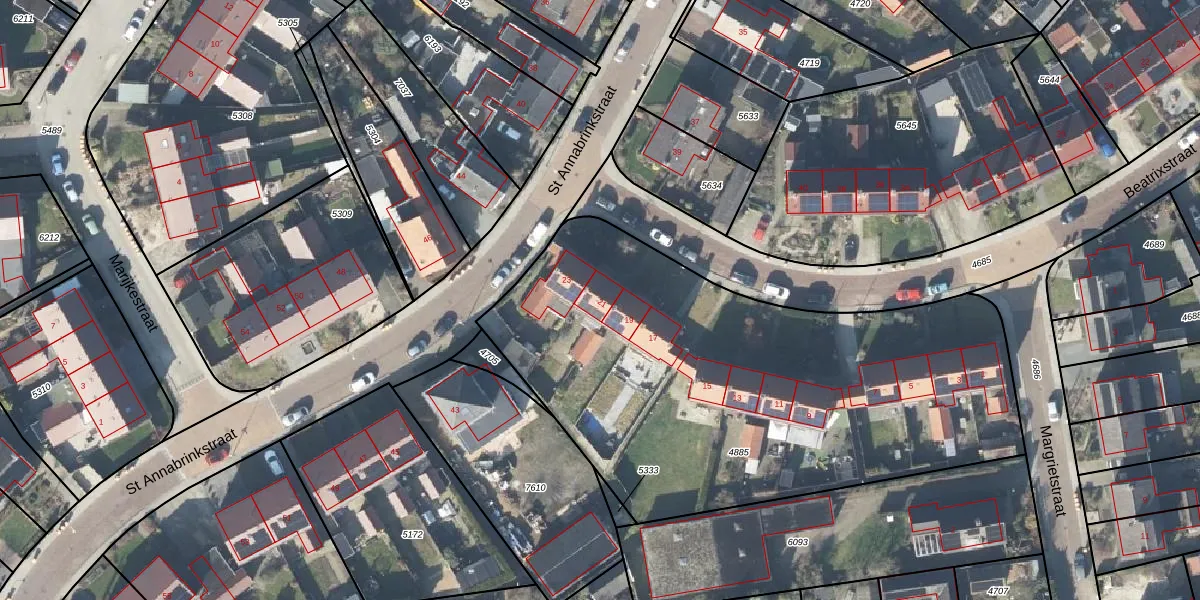 Het perceel waarop Beatrixstraat 21 staat heeft een oppervlakte van 2767 m². Dit is een zeer groot perceel. De perceeloppervlakte wordt geregistreerd door het Kadaster. Gedetailleerde informatie over de maten van dit perceel kunt u vinden in het rapport Kadastrale kaart met maatvoering van Beatrixstraat 21.