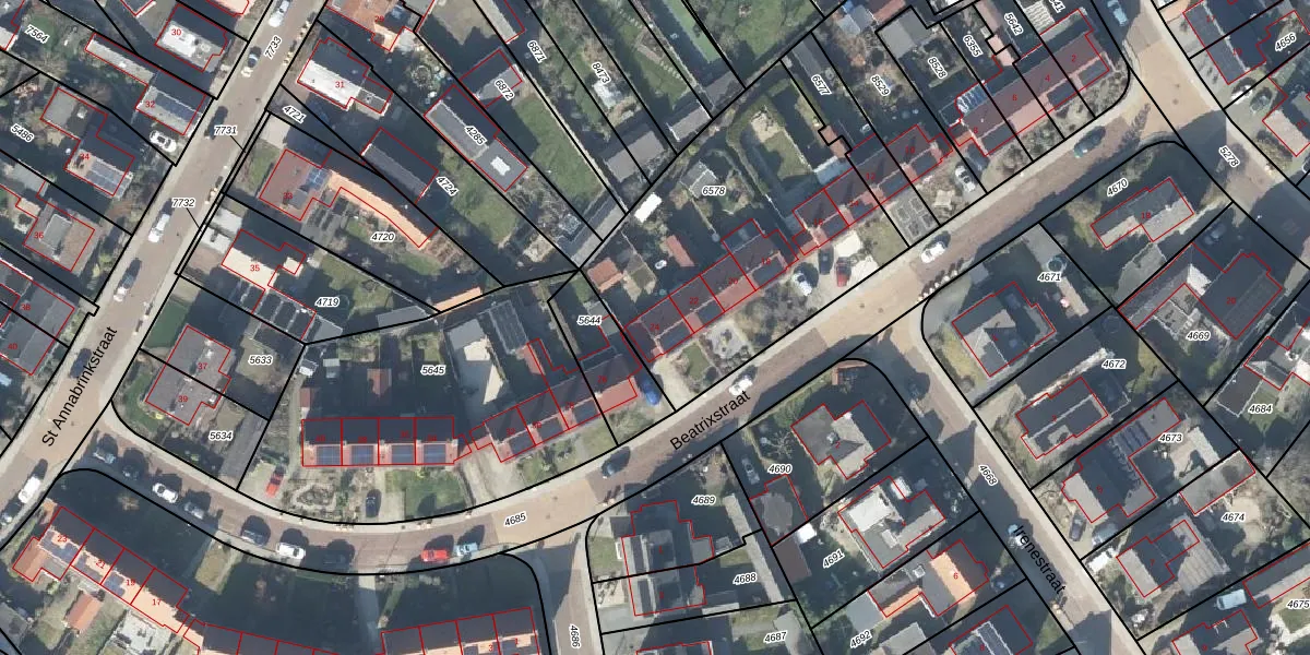 Het perceel waarop Beatrixstraat 24 staat heeft een oppervlakte van 1336 m². Dit is een zeer groot perceel. De perceeloppervlakte wordt geregistreerd door het Kadaster. Gedetailleerde informatie over de maten van dit perceel kunt u vinden in het rapport Kadastrale kaart met maatvoering van Beatrixstraat 24.