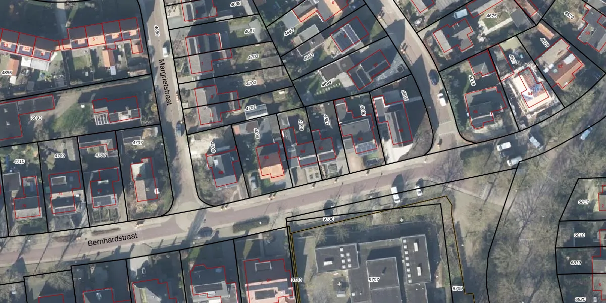 Het perceel waarop Bernhardstraat 64 staat heeft een oppervlakte van 241 m². Dit is een middelgroot perceel. De perceeloppervlakte wordt geregistreerd door het Kadaster. Gedetailleerde informatie over de maten van dit perceel kunt u vinden in het rapport Kadastrale kaart met maatvoering van Bernhardstraat 64.