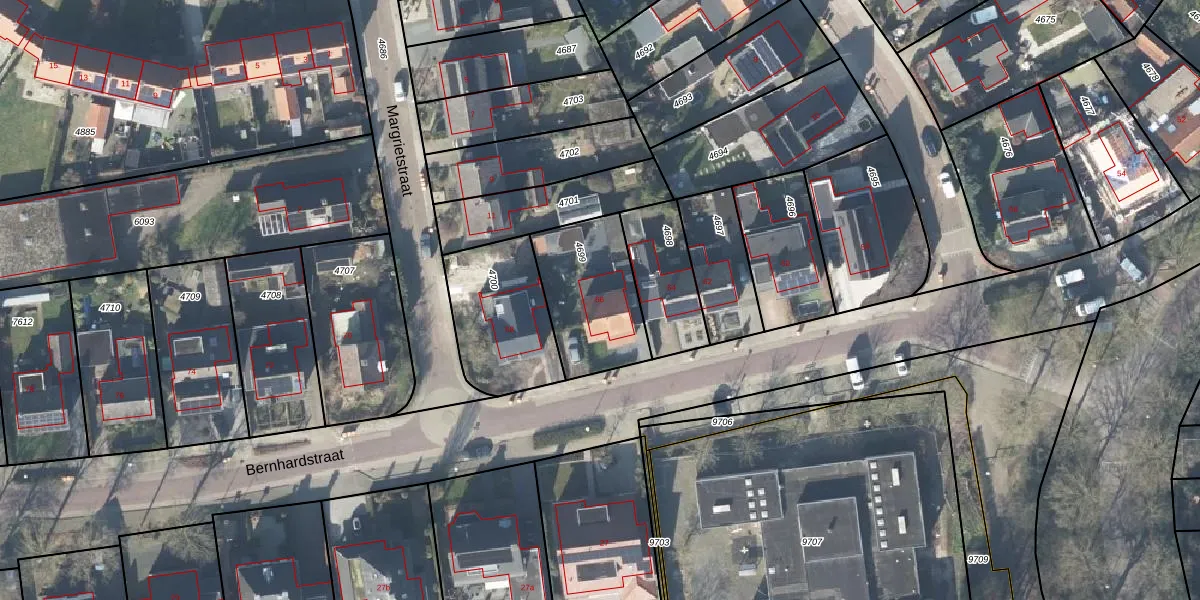 Het perceel waarop Bernhardstraat 66 staat heeft een oppervlakte van 383 m². Dit is een groot perceel. De perceeloppervlakte wordt geregistreerd door het Kadaster. Gedetailleerde informatie over de maten van dit perceel kunt u vinden in het rapport Kadastrale kaart met maatvoering van Bernhardstraat 66.