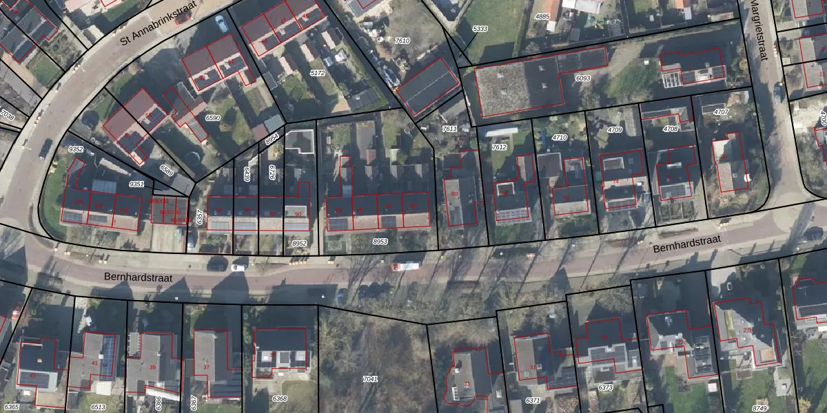 Het perceel waarop Bernhardstraat 82 staat heeft een oppervlakte van 935 m². Dit is een groot perceel. De perceeloppervlakte wordt geregistreerd door het Kadaster. Gedetailleerde informatie over de maten van dit perceel kunt u vinden in het rapport Kadastrale kaart met maatvoering van Bernhardstraat 82.