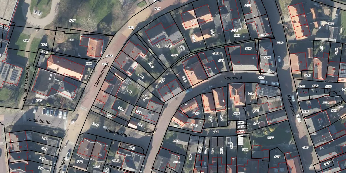 Het perceel waarop Noordwal 46 staat heeft een oppervlakte van 235 m². Dit is een middelgroot perceel. De perceeloppervlakte wordt geregistreerd door het Kadaster. Gedetailleerde informatie over de maten van dit perceel kunt u vinden in het rapport Kadastrale kaart met maatvoering van Noordwal 46.