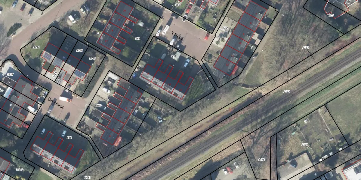 Het perceel waarop 't Reef 13 staat heeft een oppervlakte van 1104 m². Dit is een zeer groot perceel. De perceeloppervlakte wordt geregistreerd door het Kadaster. Gedetailleerde informatie over de maten van dit perceel kunt u vinden in het rapport Kadastrale kaart met maatvoering van 't Reef 13.