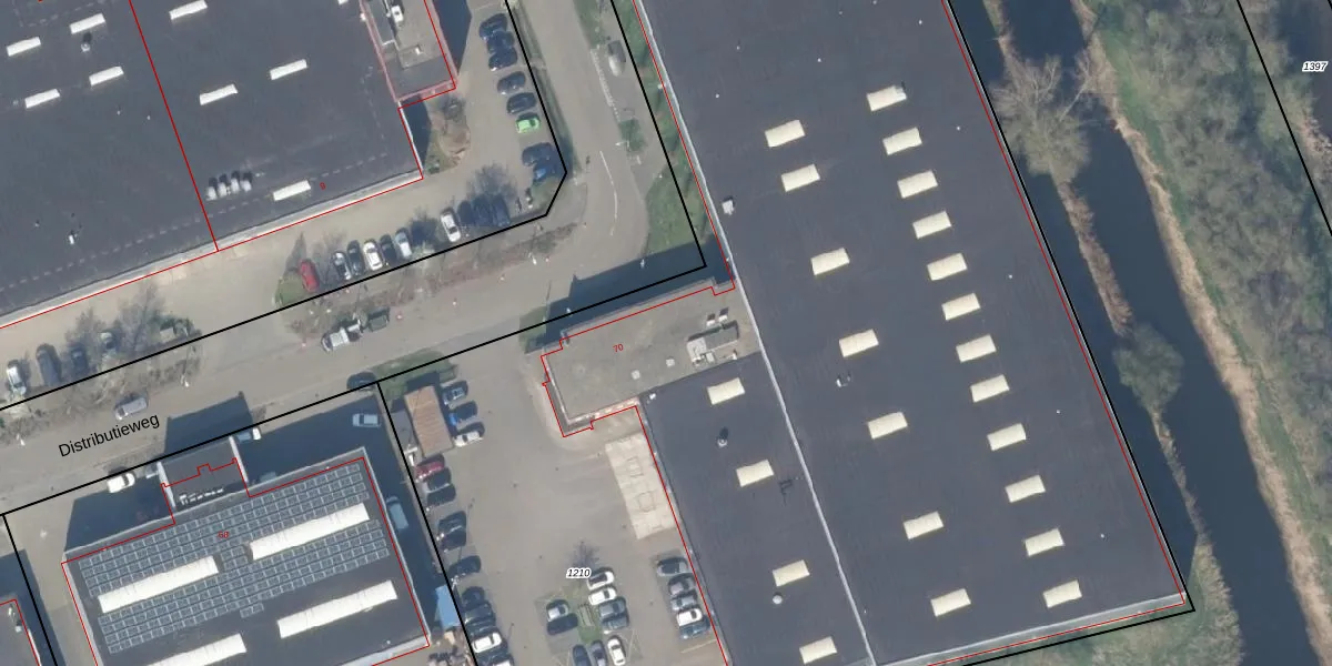 Het perceel waarop Distributieweg 70 staat heeft een oppervlakte van 1,0 ha. Dit is een zeer groot perceel. De perceeloppervlakte wordt geregistreerd door het Kadaster. Gedetailleerde informatie over de maten van dit perceel kunt u vinden in het rapport Kadastrale kaart met maatvoering van Distributieweg 70.