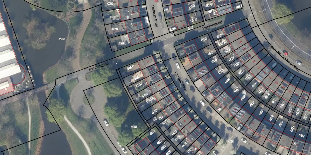 Dukaatstraat 47 is gelegen op kadastraal perceel PAK00G3271. Deze kadastrale aanduiding is uniek en wordt gebruikt door het Kadaster om eigendomsrechten en andere zakelijke rechten vast te leggen. Het perceel maakt onderdeel uit van de kadastrale gemeente Pijnacker.