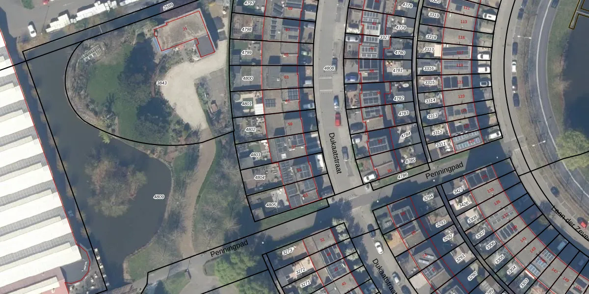 Dukaatstraat 57 is gelegen op kadastraal perceel PAK00G4803. Deze kadastrale aanduiding is uniek en wordt gebruikt door het Kadaster om eigendomsrechten en andere zakelijke rechten vast te leggen. Het perceel maakt onderdeel uit van de kadastrale gemeente Pijnacker.