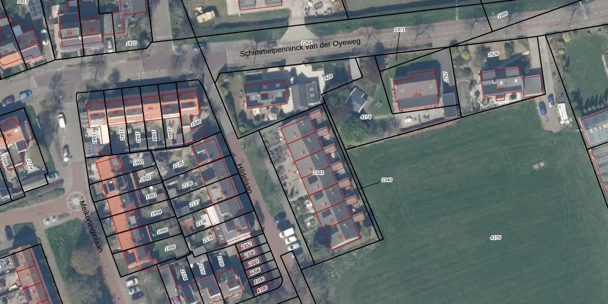 Het perceel waarop Hildelaan 3 staat heeft een oppervlakte van 1102 m². Dit is een zeer groot perceel. De perceeloppervlakte wordt geregistreerd door het Kadaster. Gedetailleerde informatie over de maten van dit perceel kunt u vinden in het rapport Kadastrale kaart met maatvoering van Hildelaan 3.