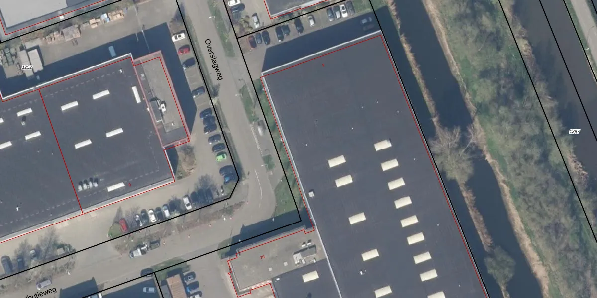 Het perceel waarop Overslagweg 9 staat heeft een oppervlakte van 1,0 ha. Dit is een zeer groot perceel. De perceeloppervlakte wordt geregistreerd door het Kadaster. Gedetailleerde informatie over de maten van dit perceel kunt u vinden in het rapport Kadastrale kaart met maatvoering van Overslagweg 9.