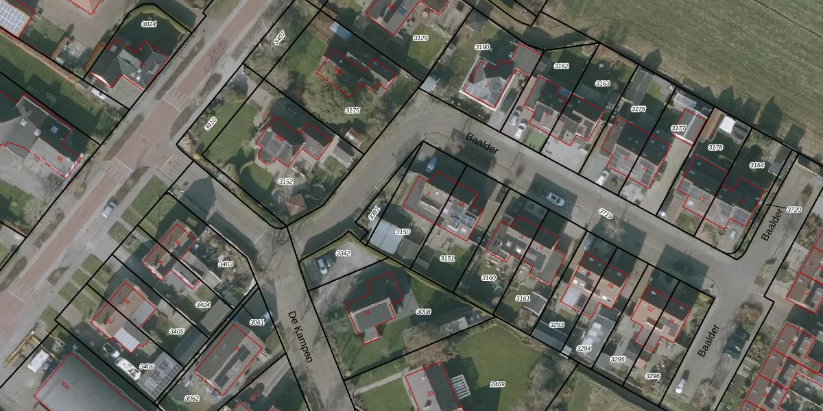 Het perceel waarop Baalder 2 staat heeft een oppervlakte van 345 m². Dit is een groot perceel. De perceeloppervlakte wordt geregistreerd door het Kadaster. Gedetailleerde informatie over de maten van dit perceel kunt u vinden in het rapport Kadastrale kaart met maatvoering van Baalder 2.